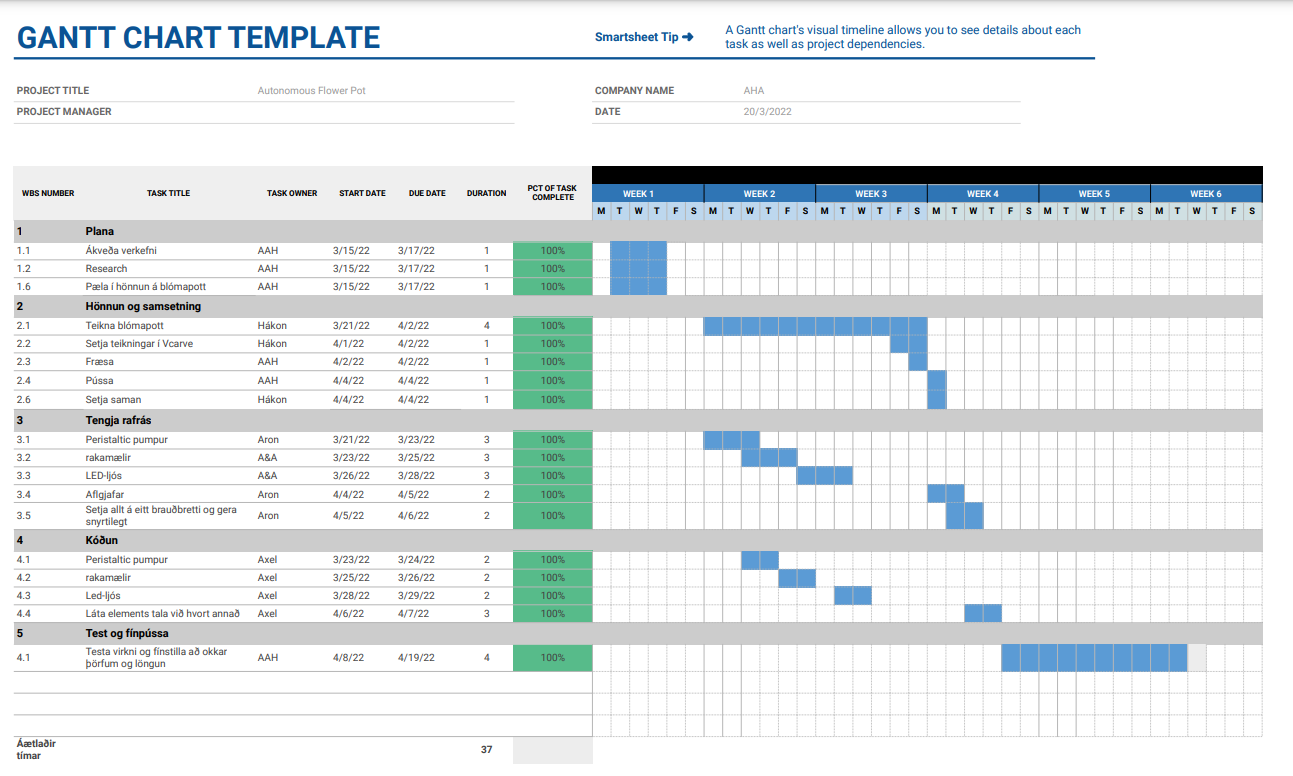 To make sure every member of the group had a pre-determined role in the assignment, the group decided to make a Gantt chart to give a rough estimate of time spent on each aspect of the assignment. The Gantt chart can be found here below: (note that some of the things included in the Gantt chart are only relevant to another project)