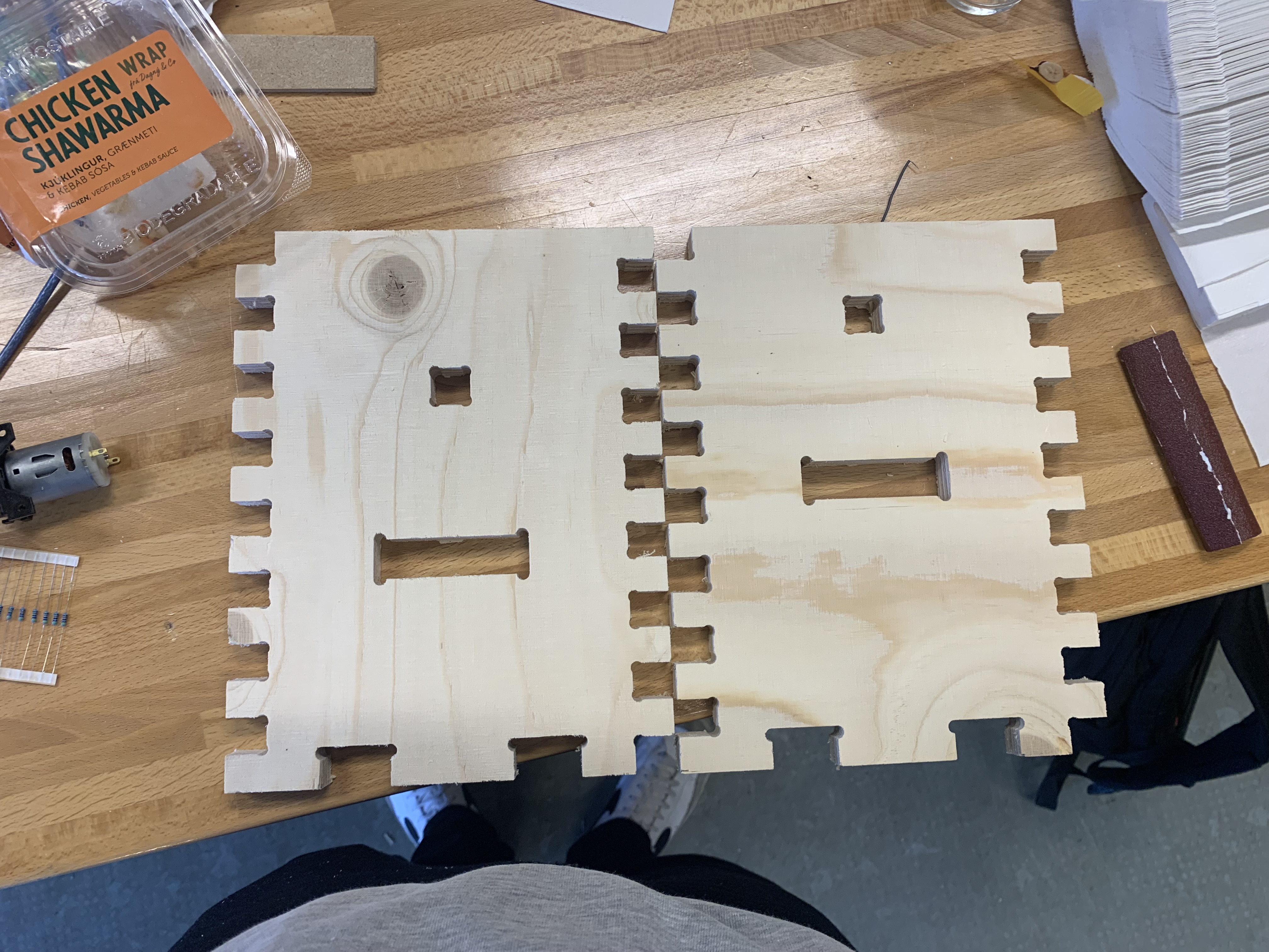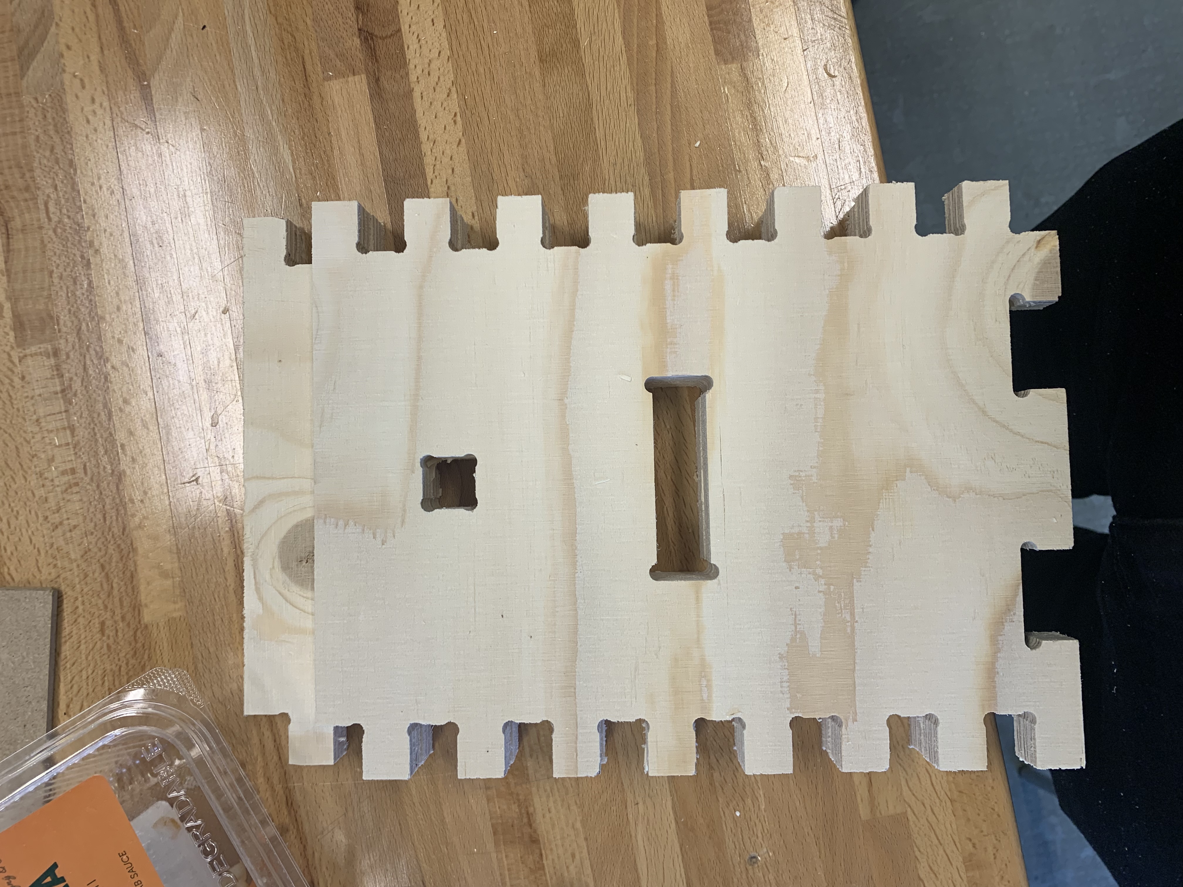 After the milling was completed the only thing left to was to assemble the pot. However we noticed that the Shop bot had messed up for some unknown reason, maybe warping in the plate, but it milled the toolpath between holes in two of our sides, and the holes were in completely the wrong place on the other two. The rest of the components however fit very tightly together. After a short chat with our teacher we concluded that the most likely reason for the failure was that since the vectors were not connected together they most likely moved when they were being prepared for the Shop Bot. Since we are recourceful we decided to just make the correct holes ourselves, and trim what didn't fit together. The correct hole was first drilled with a 17mm Ø hole saw, and then used a file to achieve the square shape. The middle platform was then trimmed with a band saw to make it fit (since the holes for the platform were in the wrong place).