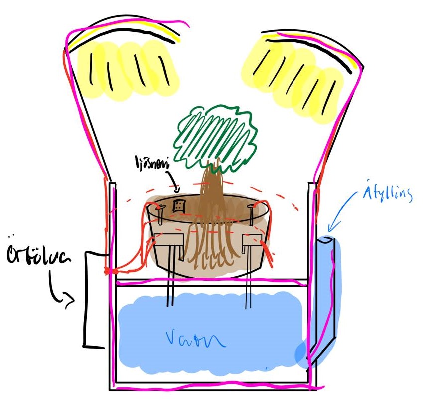 Due to the fact we were already paired together in another course and had decided to create a self-watering and -lighting flowerpot, it was ideal to make the pot in this course. The pot we were to design needed to fulfill the requirements for both assignments, so quite a lot of planning went into the design. Above is a rough draft of the pot.