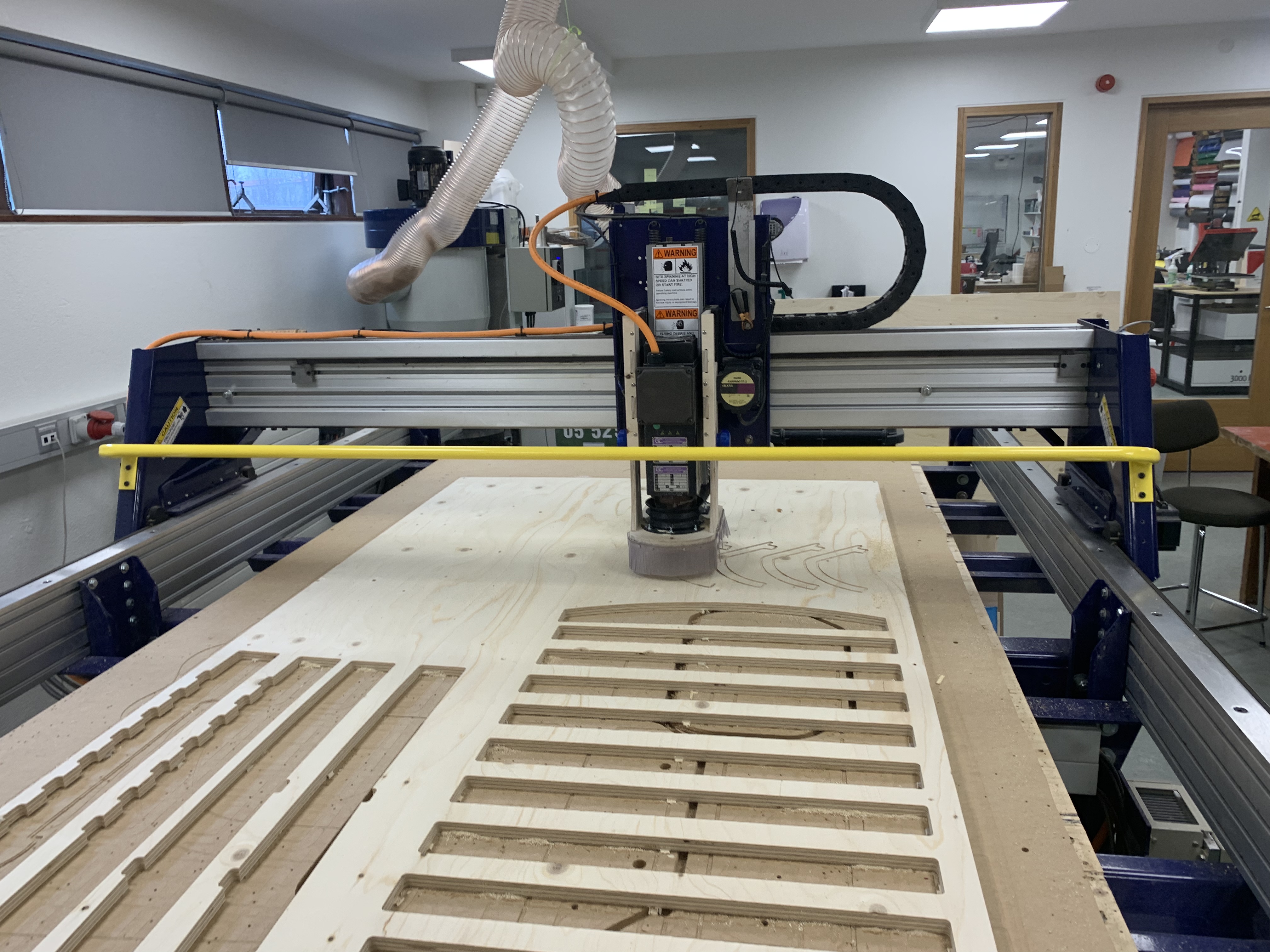 For the milling to work you first have to download an application, called Vcarve, and a link to the application can be found here. The application you can download for free is a trial version, but everything you'll need is included in that version. To get started, you first have to import your Fusion 360 drawings as a .DXF (Drawing Exchange Format) file, and import that into Vcarve. From there you can set your feeds and speeds, as well as the toolpaths. For your settings to be accurate you have to know what kind of milling teeth you'll be working with. In our case there were two. 6 mm Down-cut, which means the grain is pushed downwards for a finer edge was used for the first 3 mm, and then a 6 mm Up-cut for the rest of the milling