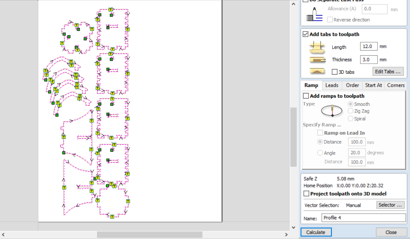 Your toolpaths represent the movement the milling machine will have to take in order to mill your object. In our case all the milling should fully penetrate the object so we click "profile toolpath". From there we create two toolpaths, one for the down-cut in the range 0 - 3mm and one for the up-cut in the range 3-18mm which should cut through the plate. Make sure you pick the right tools for each toolpath. Lastly you need to add tabs to your toolpath. The purpose of the tabs is to make sure nothing moves while the milling is taking place so that everything comes out right. Lastly you click calculate and the toolpath is ready. Below you can see the toolpaths as well as the tabs: